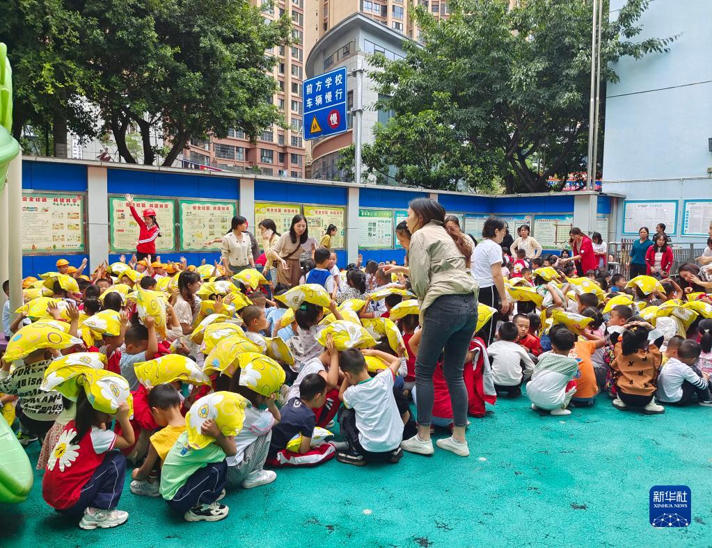 9月5日,雅安市石棉縣幼兒園老師組織幼兒有序疏散到操場,并對幼兒進行心理疏導。