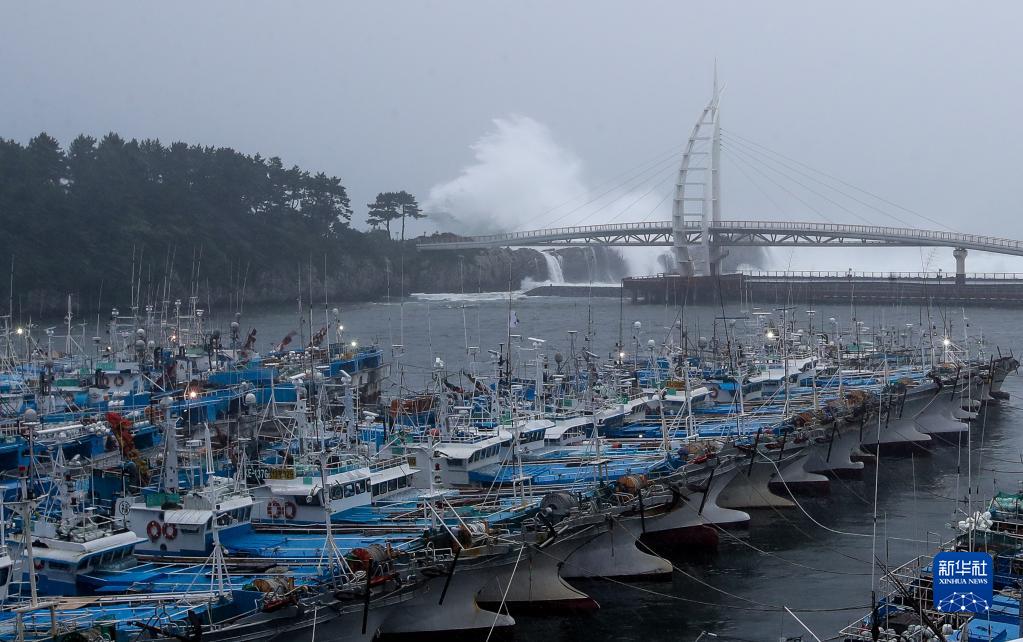 這是9月5日在韓國濟州島拍攝的港口停泊船只和遠處掀起的海浪。