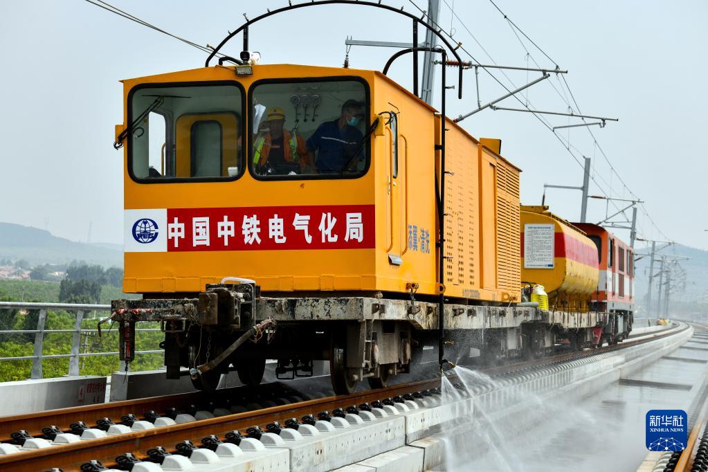9月5日,在濟萊高鐵章丘段,隧道清洗車在清洗道床。
