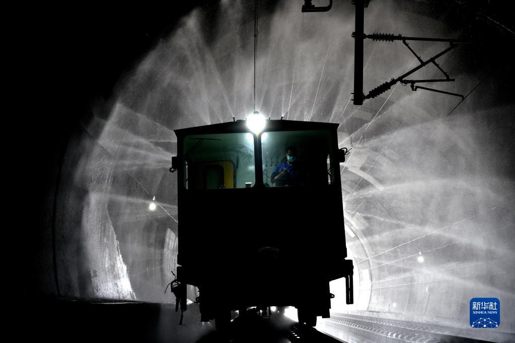 9月5日,在濟萊高鐵章丘段,隧道清洗車在清洗隧道壁。