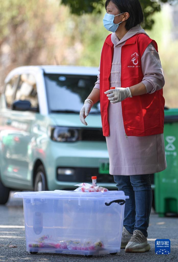 9月5日,在貴陽市云巖區大營路街道中天花園社區核酸檢測現場,一名志愿者在轉運核酸檢測樣本。