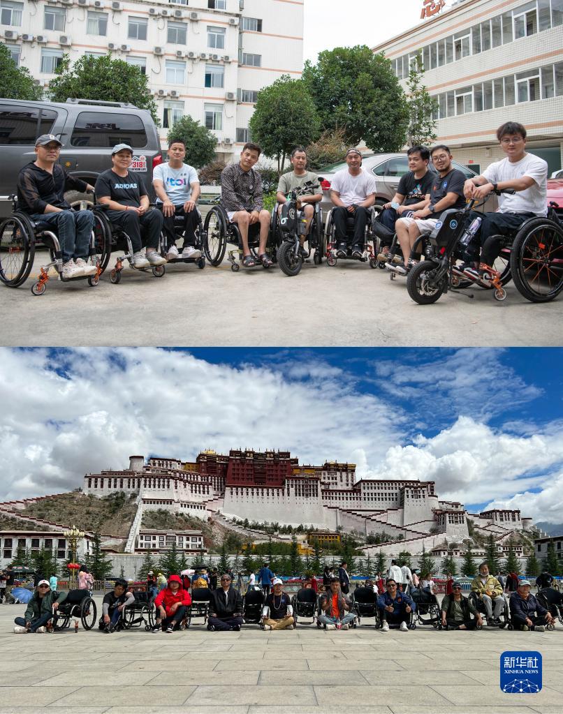 拼版照片:上圖為7月16日,在成都“泉心健康之家生活重建訓(xùn)練營(yíng)”,何鵬(右二)與輪友們?cè)凇按ú鼐€”自駕出發(fā)前合影(新華社記者 胥冰潔 攝);下圖為7月30日,何鵬(左五)與輪友們?cè)诓歼_(dá)拉宮前合影(受訪者供圖)。