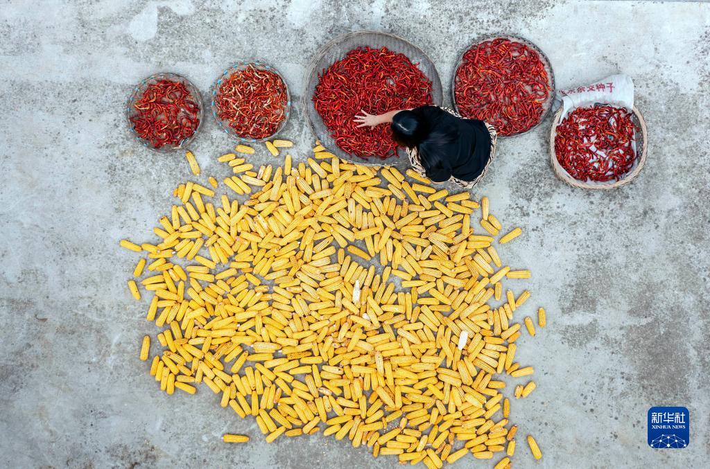 9月5日, 村民在貴州省黔西市定新彝族苗族鄉(xiāng)新村村晾曬辣椒和玉米(無人機(jī)照片)。