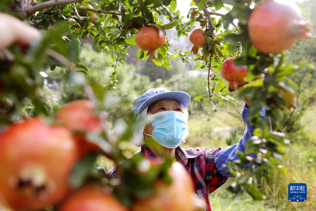 9月5日,在江蘇省連云港市朝陽街道韓李村,農民在田園中采摘石榴。