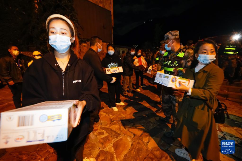9月5日晚,在四川甘孜州瀘定縣磨西鎮(zhèn)的受災群眾臨時安置點,人們在傳遞救災物資。