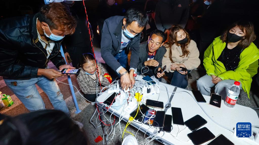 9月5日晚,在四川甘孜州瀘定縣磨西鎮的受災群眾臨時安置點,人們在中國電信便民服務點為手機充電。