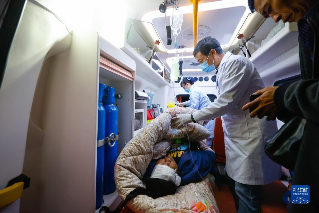9月5日晚,在四川甘孜州瀘定縣磨西鎮的受災群眾臨時安置點,醫務人員在轉運傷員。