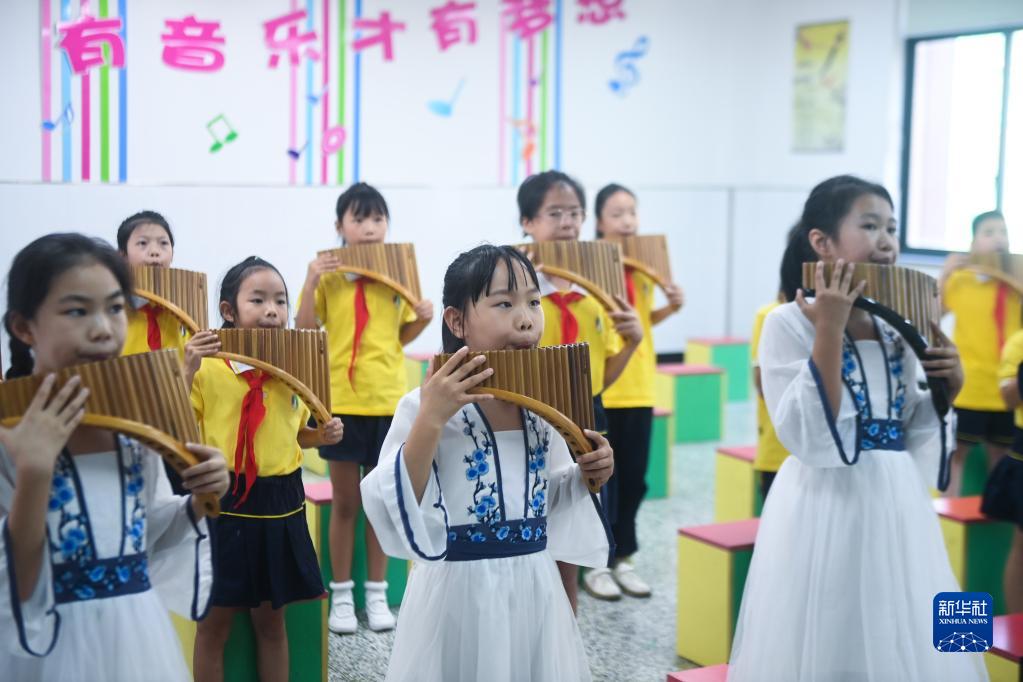 9月6日,板橋鎮(zhèn)板橋小學(xué)的學(xué)生在上排簫課。