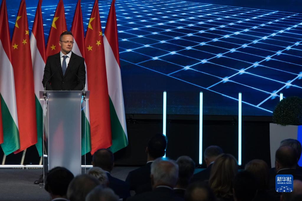 9月5日,在匈牙利德布勒森,匈牙利外交與對外經(jīng)濟(jì)部長西雅爾多·彼得在簽約現(xiàn)場致辭。