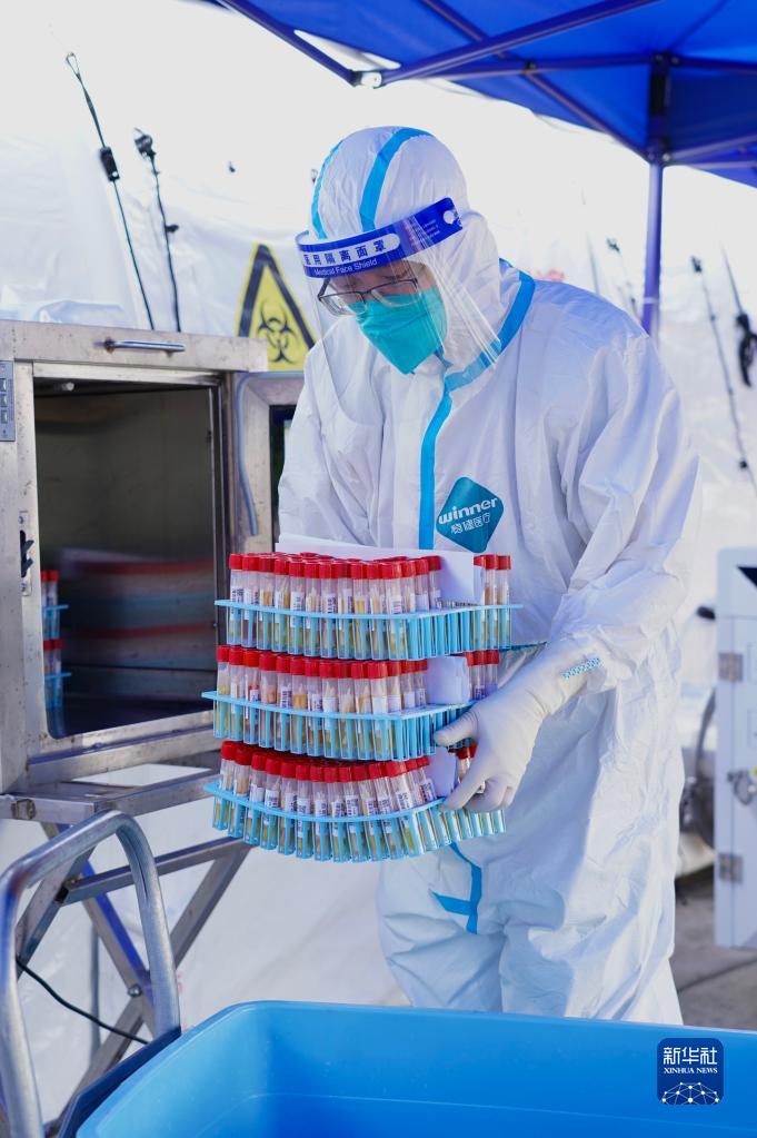 9月5日,氣膜方艙實(shí)驗(yàn)室的核酸檢測隊(duì)工作人員對已檢測標(biāo)本進(jìn)行轉(zhuǎn)運(yùn)處理。