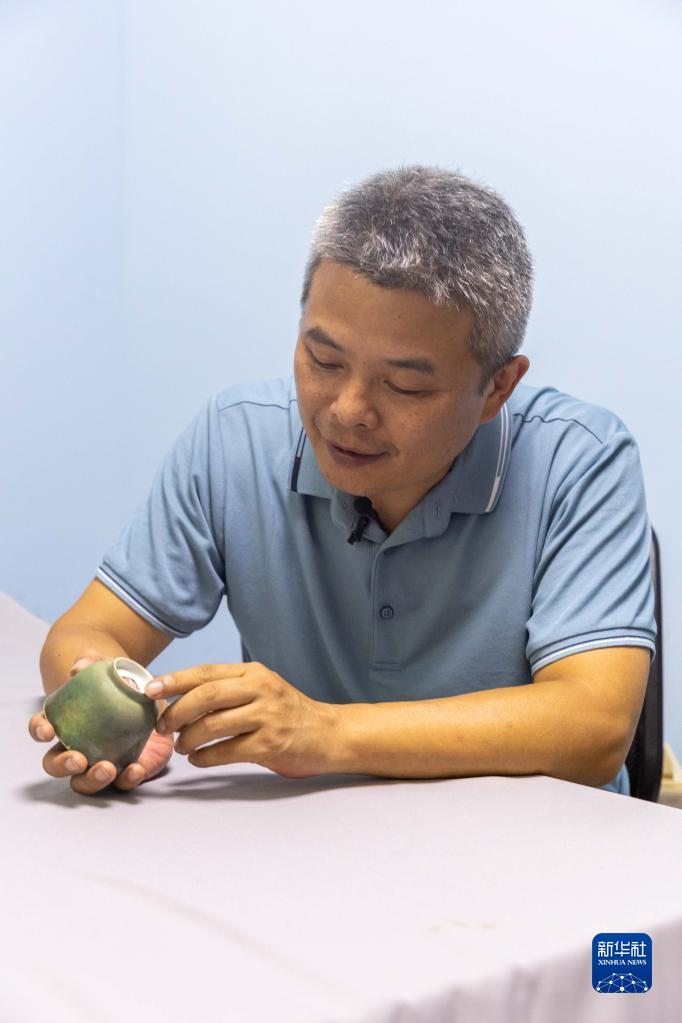 8月23日,上海市文物保護研究中心副主任翟楊展示長江口二號古船出水文物綠釉杯。