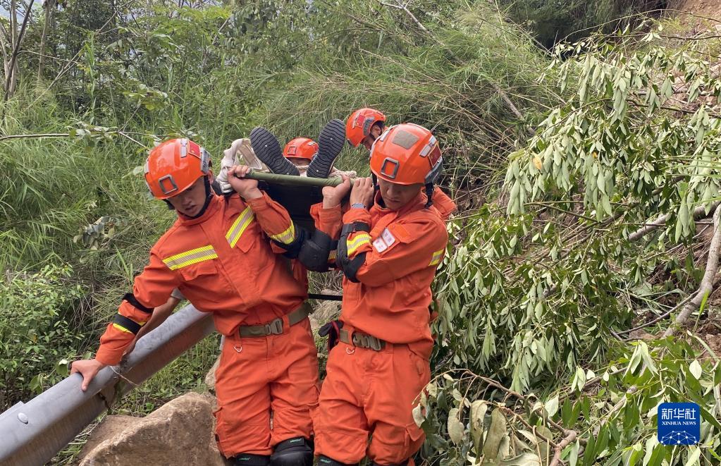 9月6日,四川森林消防總隊甘孜支隊消防員在瀘定縣得妥鎮紫雅場村轉運傷員。