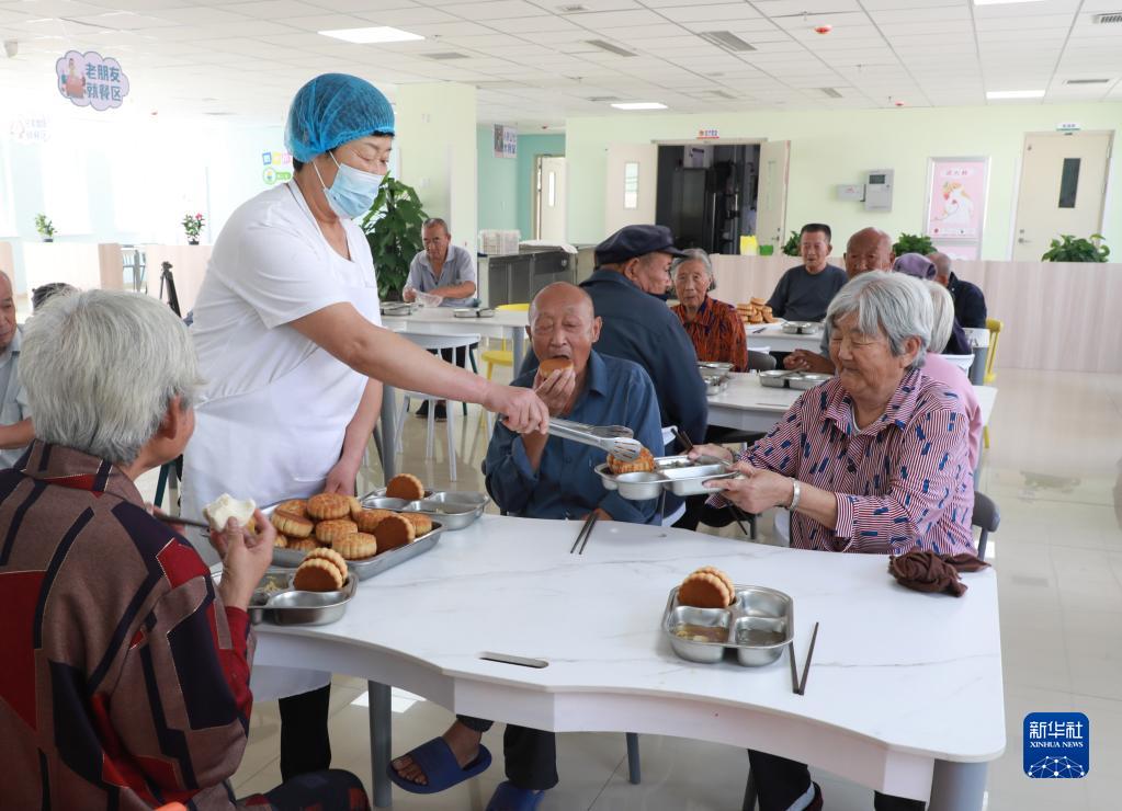 9月6日,在山東省濱州市沾化區康教醫養綜合服務中心餐廳,工作人員在為老人發放中秋月餅。