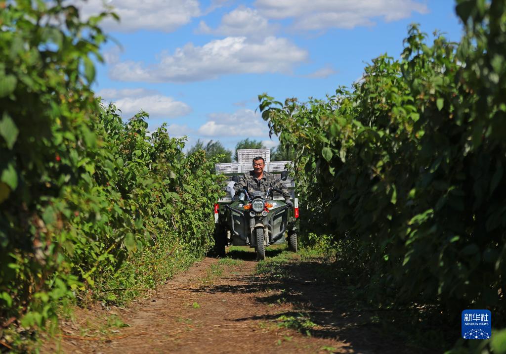9月6日,在法庫縣登仕堡子鎮西登仕堡子村樹莓種植基地,農民運送樹莓。