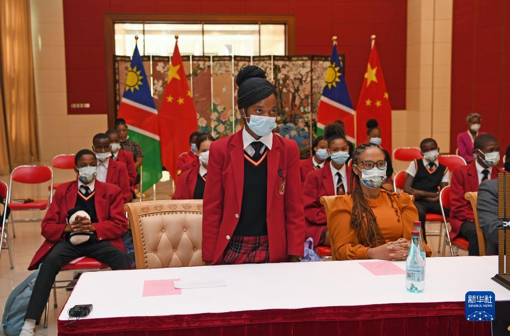 9月6日,在納米比亞首都溫得和克的“天宮對(duì)話(huà)”活動(dòng)納米比亞分會(huì)場(chǎng),一名學(xué)生向中國(guó)航天員提問(wèn)。
