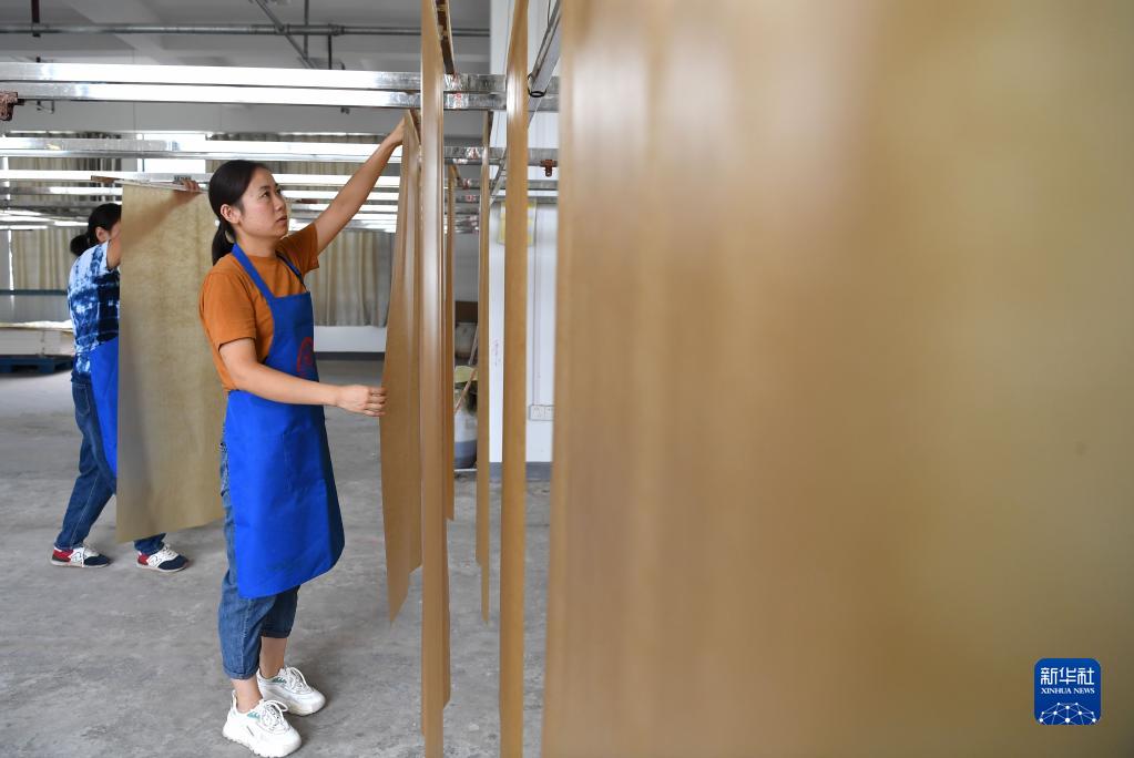 9月8日,在紙箋加工技藝傳習基地,工人在進行紙箋加工的提掛工序。