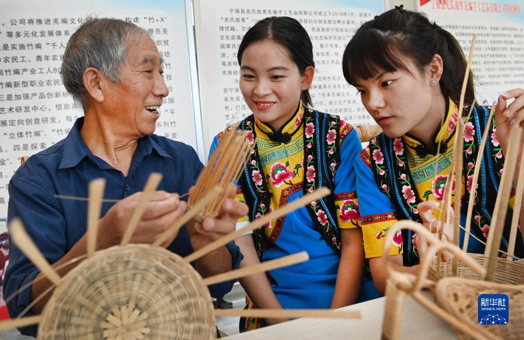 9月7日,在寧強縣羌族文化博覽園,非遺傳承人童正明(左一)在給前來學習的年輕人傳授羌編技巧。寧強縣在傳承羌編技藝的同時,對傳統羌編產品進行創新,產品深受消費者歡迎。