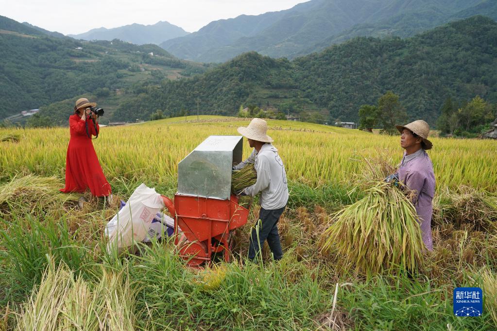 9月7日,在嵐皋縣南宮山鎮桂花村古梯田上,一名攝影愛好者在拍攝收水稻的村民。