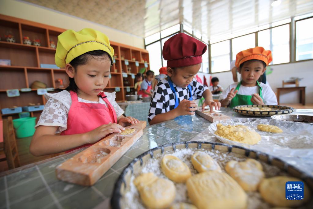 9月8日,貴州省黔東南苗族侗族自治州從江縣剛邊壯族鄉(xiāng)中心幼兒園的小朋友在學習制作月餅。