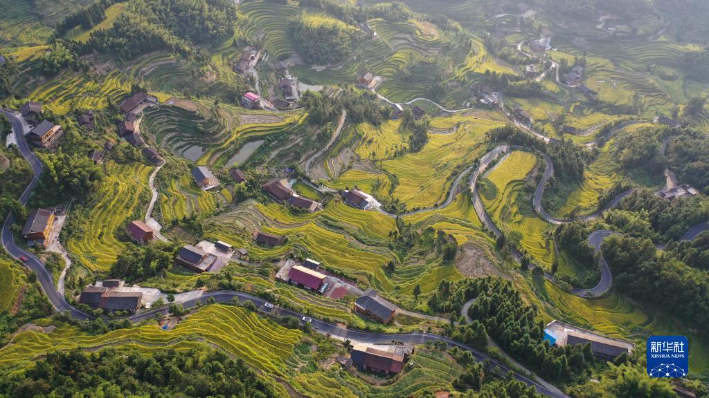 在中國農民豐收節即將到來之際,“世界灌溉工程遺產”“全球重要農業文化遺產”湖南省婁底市新化縣水車鎮紫鵲界梯田種植的水稻陸續進入成熟期,田野一片金黃,農民利用晴好天氣搶收搶割。