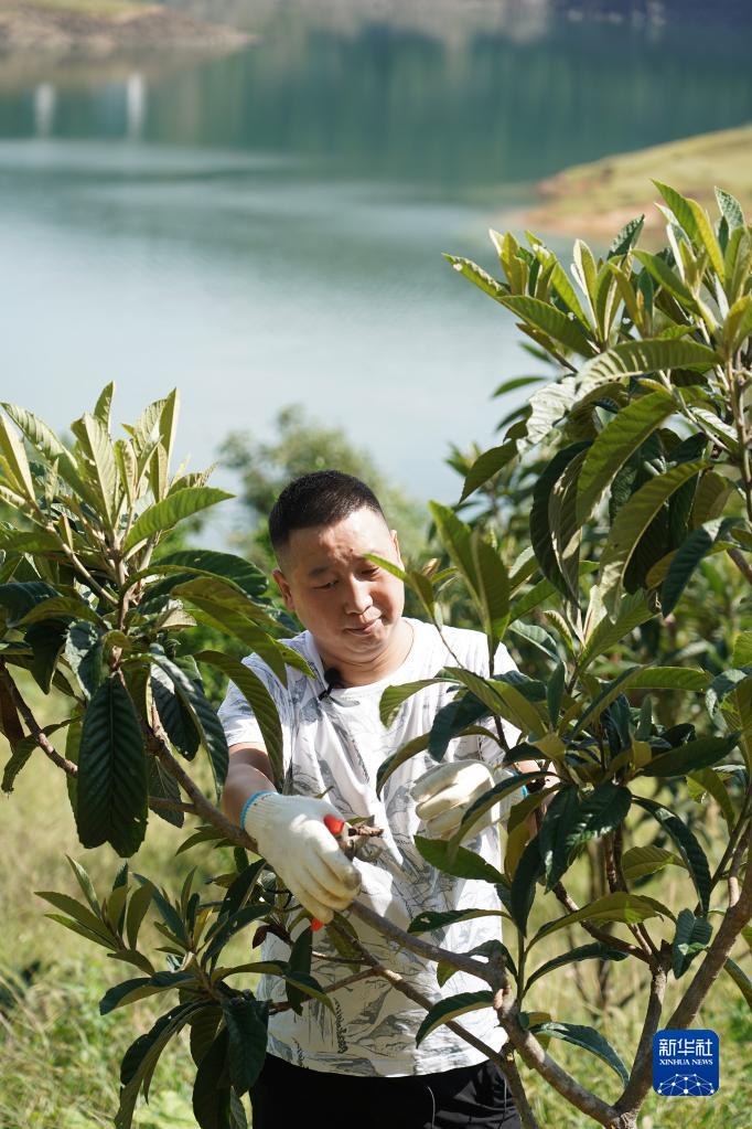 9月6日,在漢江瀛湖邊的枇杷果園內,安康市漢濱區瀛湖鎮橋興村村民唐濤邦在修剪果樹。為避免影響水質,安康市漢濱區拆除漢江瀛湖上的養魚網箱3萬多口。像唐濤邦一樣,許多昔日的漁民轉型成為果農、茶農。