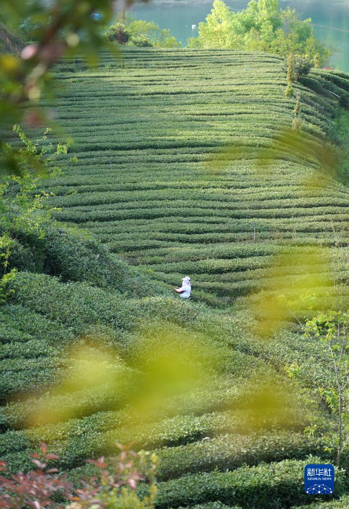 安康市漢濱區流水鎮茶農在漢江邊的茶園采茶(4月8日攝)。