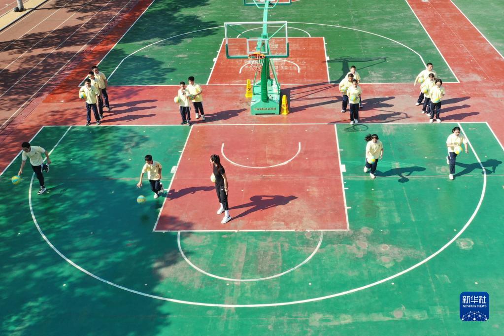 9月6日,于紅俊(前中)在長(zhǎng)沙市明德華興中學(xué)給學(xué)生上體育課(無(wú)人機(jī)照片)。