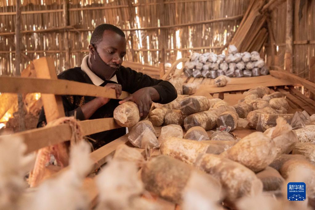 2020年9月9日,在盧旺達首都基加利的一家食用菌培育作坊,作坊主人埃馬紐埃爾·阿希馬納檢查菌袋。中國福建農林大學的菌草專家2006年來到盧旺達開始菌草技術合作項目,在當地示范和推廣菌草技術。“利用菌草技術種植食用菌,在盧旺達現在可是一項利潤豐厚的生意,這對人們擺脫貧困很有幫助,”曾經為全家衣食煩心的阿希馬納說,“我有4個孩子,菌草技術帶來的收入,除去孩子學費和生活開支,我還能存下一些資金繼續壯大自己的生意。中國人的菌草技術,讓我和其他很多人受益。”