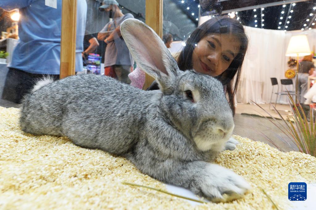 9月8日,觀眾在泰國曼谷舉行的寵物博覽會上觀看一只巨型花明兔。