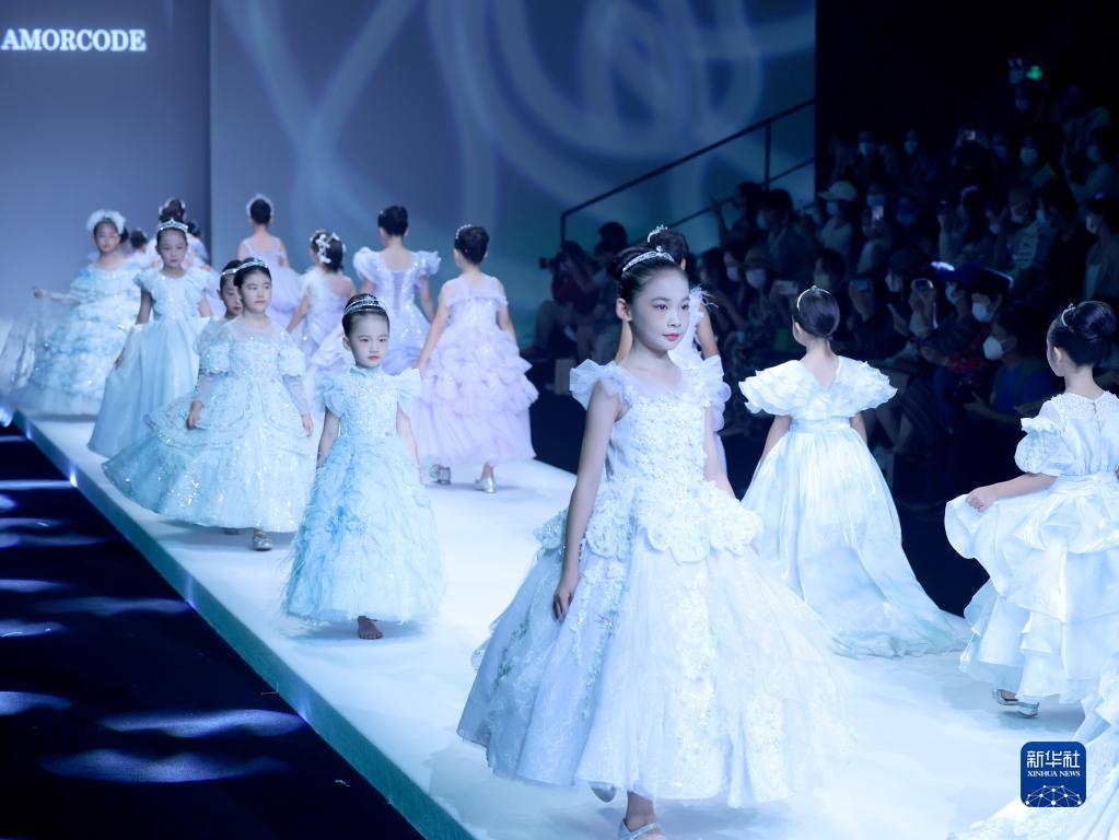 9月9日,小模特在北京中國國際時裝周(2023春夏系列)舉行的“AMORCODE”童裝發布會上展示童裝。