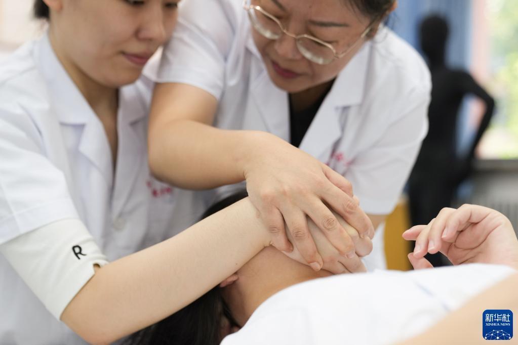 在北京聯合大學保健按摩實訓課上,張琳(右)握著一位視障學生的手帶她感受按摩的力度和角度(9月8日攝)。
