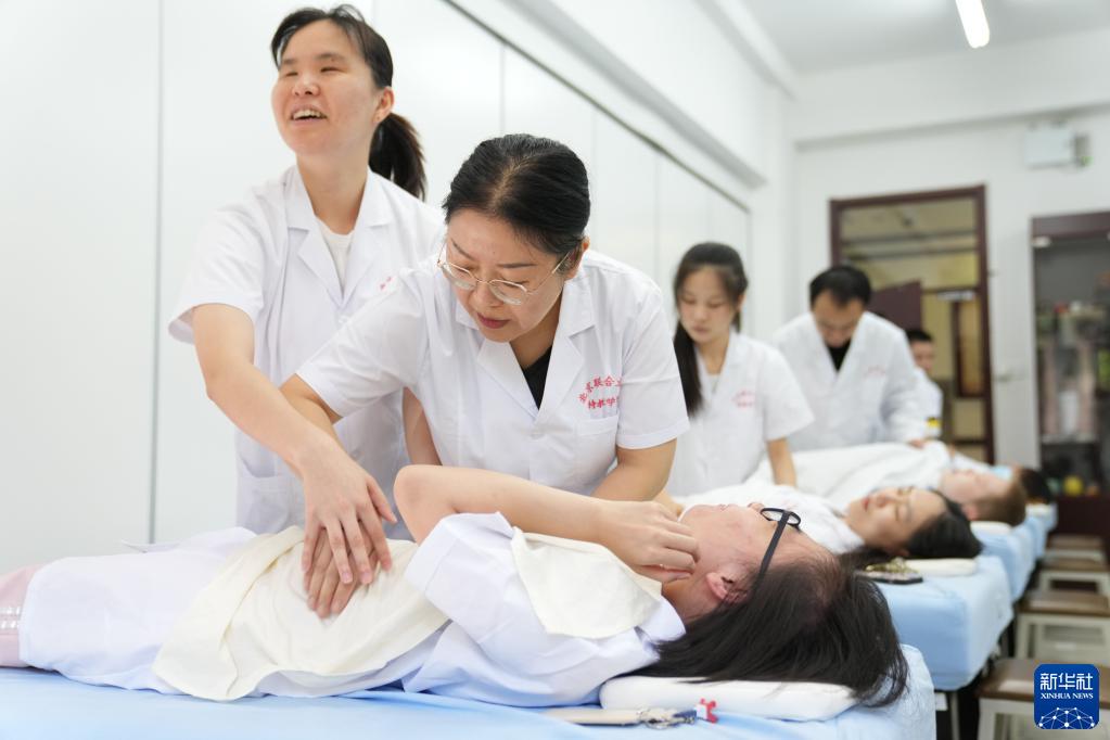 在北京聯(lián)合大學保健按摩實訓課上,張琳(前右)讓一位視障學生摸著她的手感受按摩力度和角度(9月8日攝)。