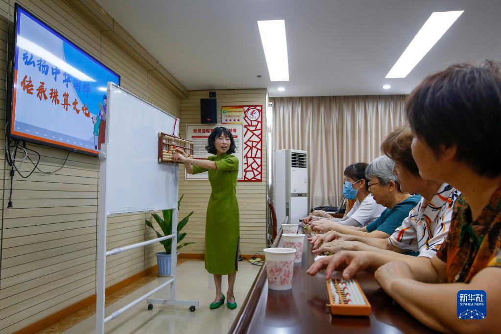 9月7日,在安徽省黃山市前園社區黨群服務中心,汪素秋為社區居民傳授珠算知識。