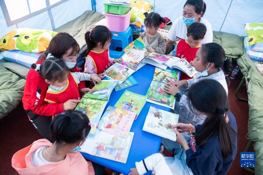 9月9日,在四川省石棉縣新民鄉海耳村臨時安置點,老師帶領孩子們看書。
