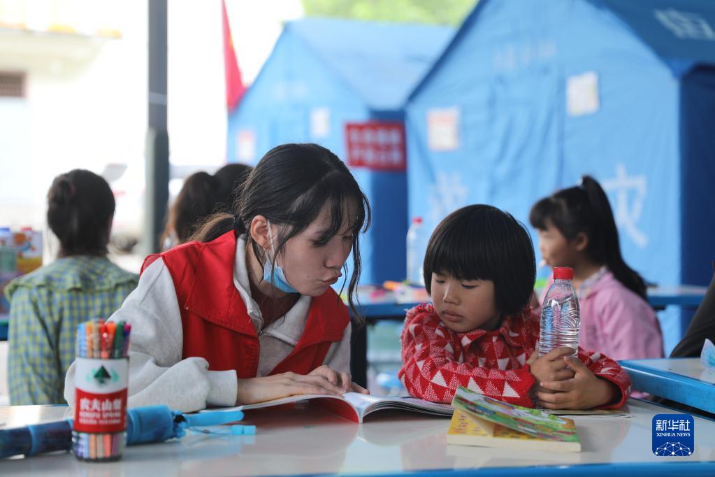 四川省甘孜州瀘定縣6.8級地震發生后,在雅安市石棉縣的臨時安置點里,老師和志愿者帶領孩子們學習、畫畫、做游戲,在這個特殊時期安撫和陪伴他們。