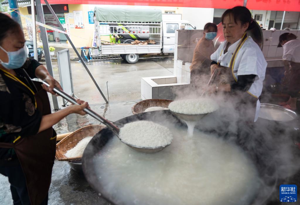 9月9日,在石棉縣新民鄉(xiāng)海耳村臨時安置點,村民志愿者在做飯。
