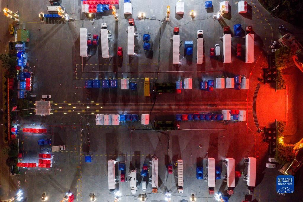 9月9日晚拍攝的貴陽市筑城廣場移動方艙核酸檢測基地(無人機照片)。