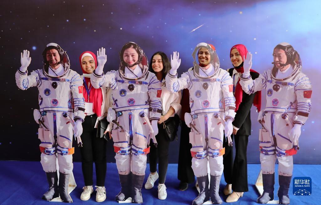 9月6日,在埃及開羅,埃及青年學(xué)生在“天宮對(duì)話”活動(dòng)埃及分會(huì)場(chǎng)拍照。