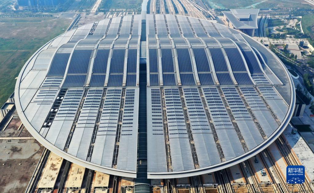 京雄城際鐵路雄安站站頂分布式光伏電站(9月9日攝,無人機(jī)照片)。