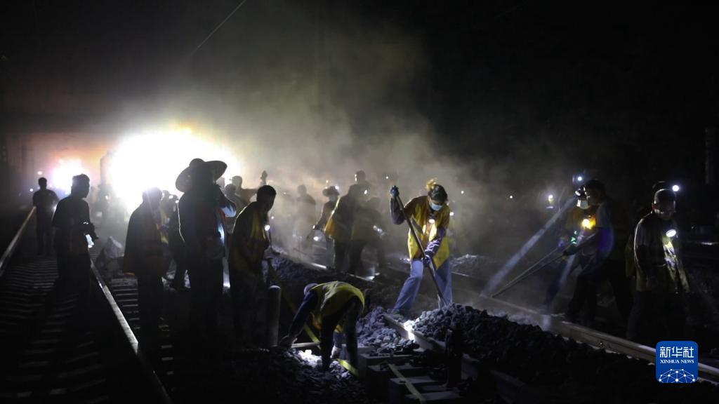 工人在柳州太陽村站進行夜間換岔施工(9月10日攝)。
