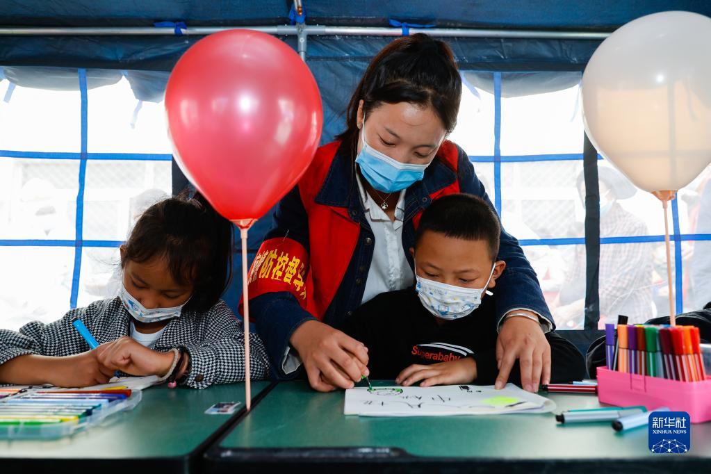 9月10日,在瀘定二中臨時安置點(diǎn)的“帳篷課堂”里,老師志愿者孫燕(中)在教孩子畫畫。