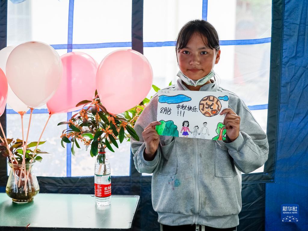 9月10日是中秋節(jié),也是教師節(jié),這些志愿者自費買來氣球、彩色貼紙、文具等,將三個帳篷裝點成“帳篷課堂”,帶領(lǐng)孩子們畫畫、做游戲、制作創(chuàng)意“月餅”等,一同度過特別的暖心節(jié)日。
