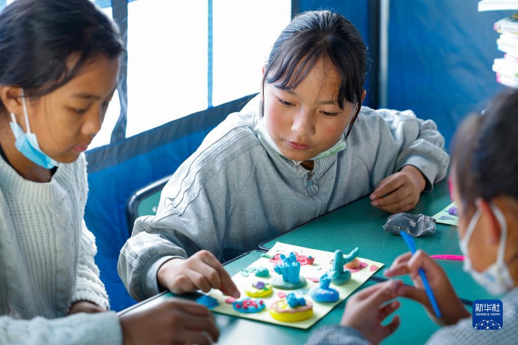 9月10日,在瀘定二中臨時(shí)安置點(diǎn)的“帳篷課堂”里,來自得妥鎮(zhèn)的孩子們用橡皮泥制作創(chuàng)意“月餅”。