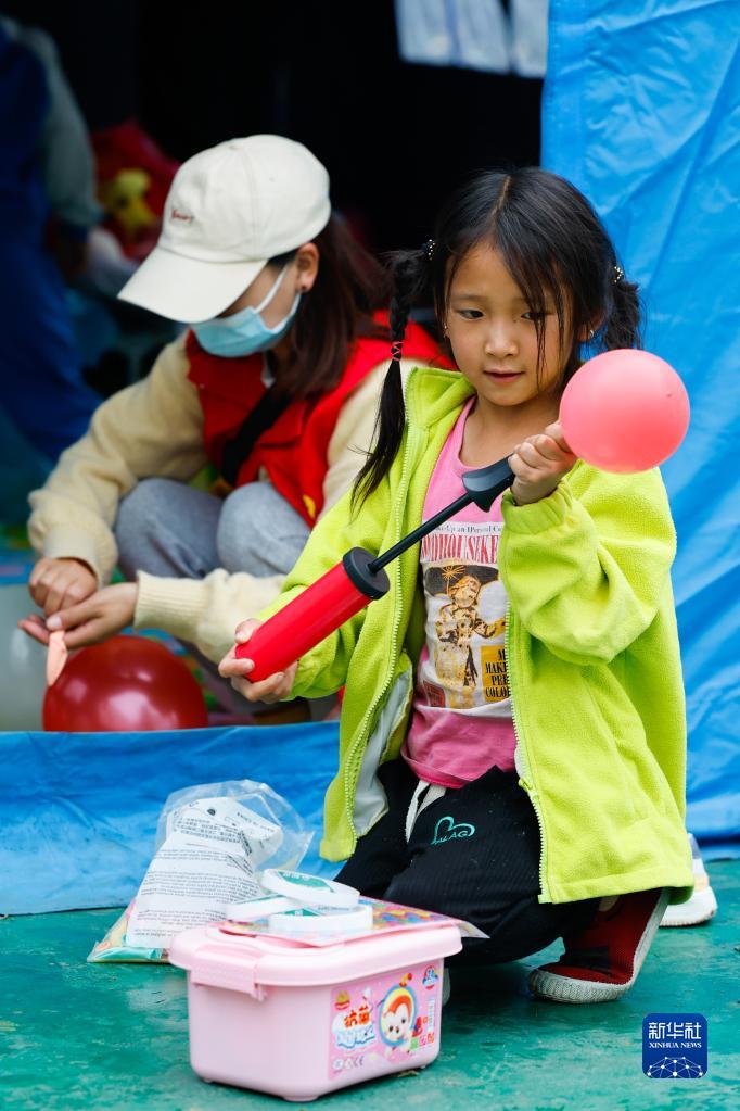 9月10日,在瀘定二中臨時安置點,一名來自得妥鎮的小朋友在幫志愿者打氣球。