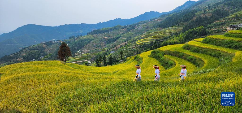 9月10日,游客身著花瑤服飾在湖南省懷化市溆浦縣葛竹坪鎮山背梯田中游玩。