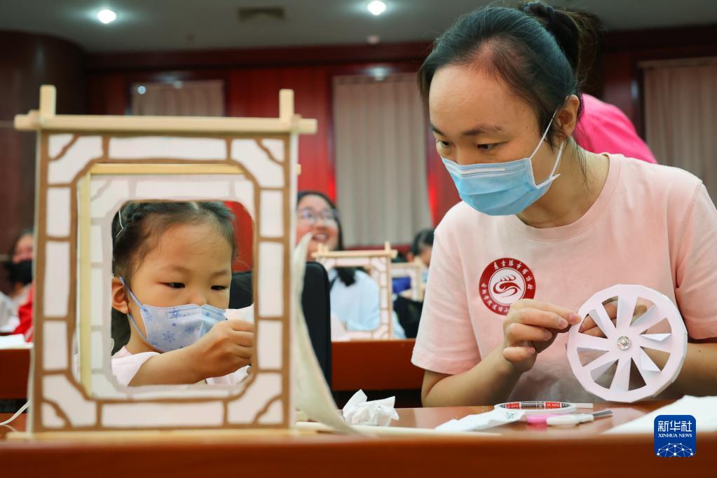 9月10日,在江蘇連云港市博物館,小朋友在家長協(xié)助下制作走馬燈。