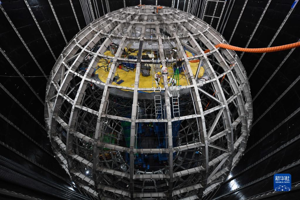 這是9月2日拍攝的位于地下700米的江門中微子實驗探測器,呈現出巨大的球形結構。