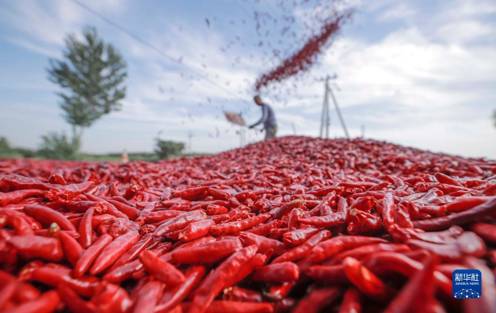 9月8日,河北省玉田縣亮甲店鎮(zhèn)農(nóng)民在場(chǎng)院晾曬辣椒。