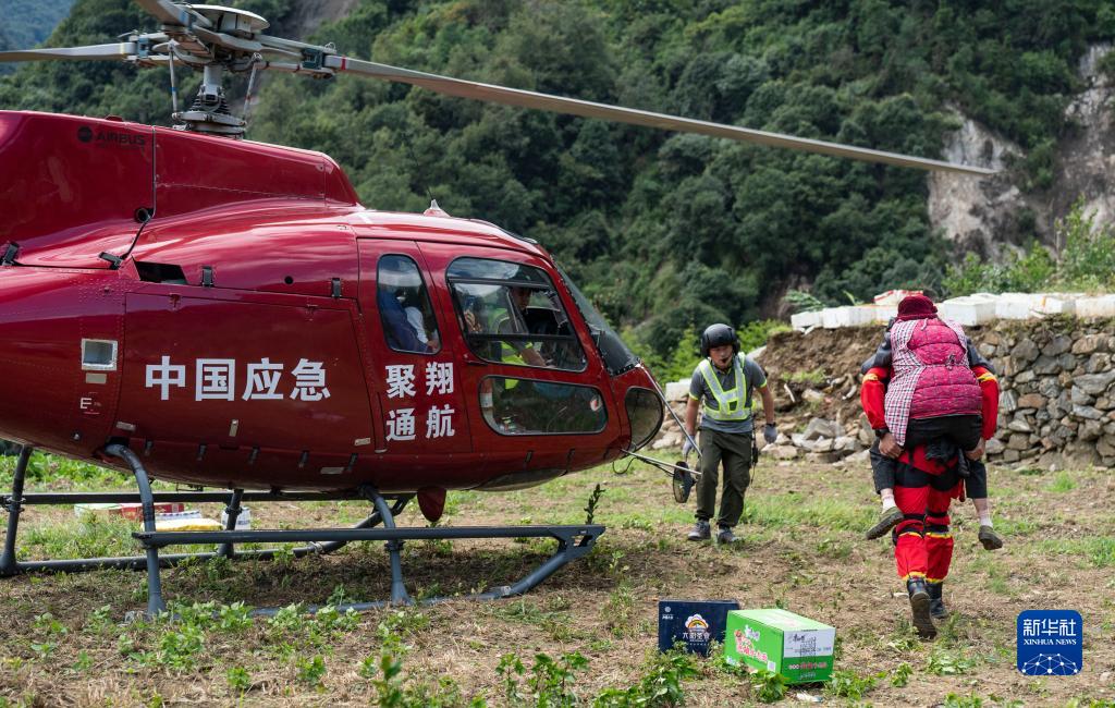 9月10日,在四川省石棉縣王崗坪彝族藏族鄉幸福村,救援人員在轉運患病老人。