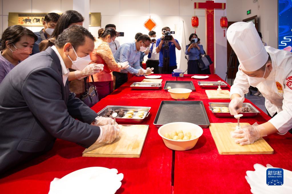 9月9日,人們?cè)谖挥诶蠐胧锥既f象的老撾中國文化中心學(xué)做月餅。